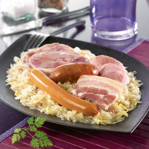 Choucroute 650g – Garniture 350g – 2 saucisses de Strasbourg – 2 saucisses fumées – 2 tranches de filet de porc cuit – 2 tranches de saucisson à l’ail