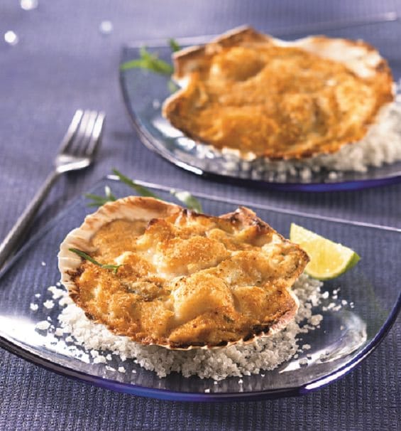 70 % noix de St Jacques, vin blanc, champignons, bisque de homard, cognac, épices.