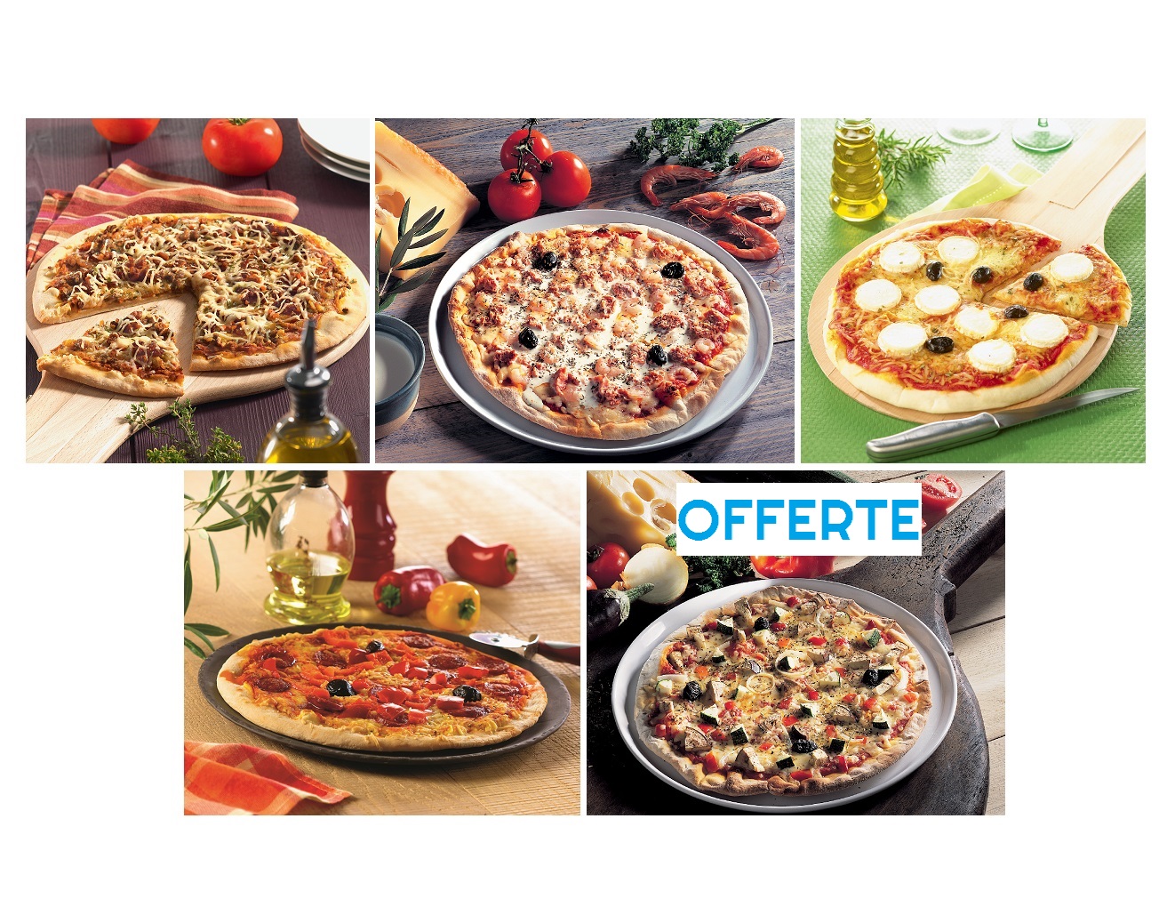 1 pizza bûche de chèvre miel, 1 pizza mozzarella pesto, 1 pizza pêcheur, 1 pizza crémière lardons et 1 pizza jambon fromage OFFERTE