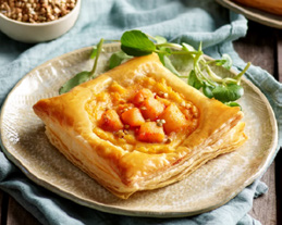 Pâte feuilletée garnie d’une préparation aux noix de St-Jacques, aux légumes et au concentré de Homard